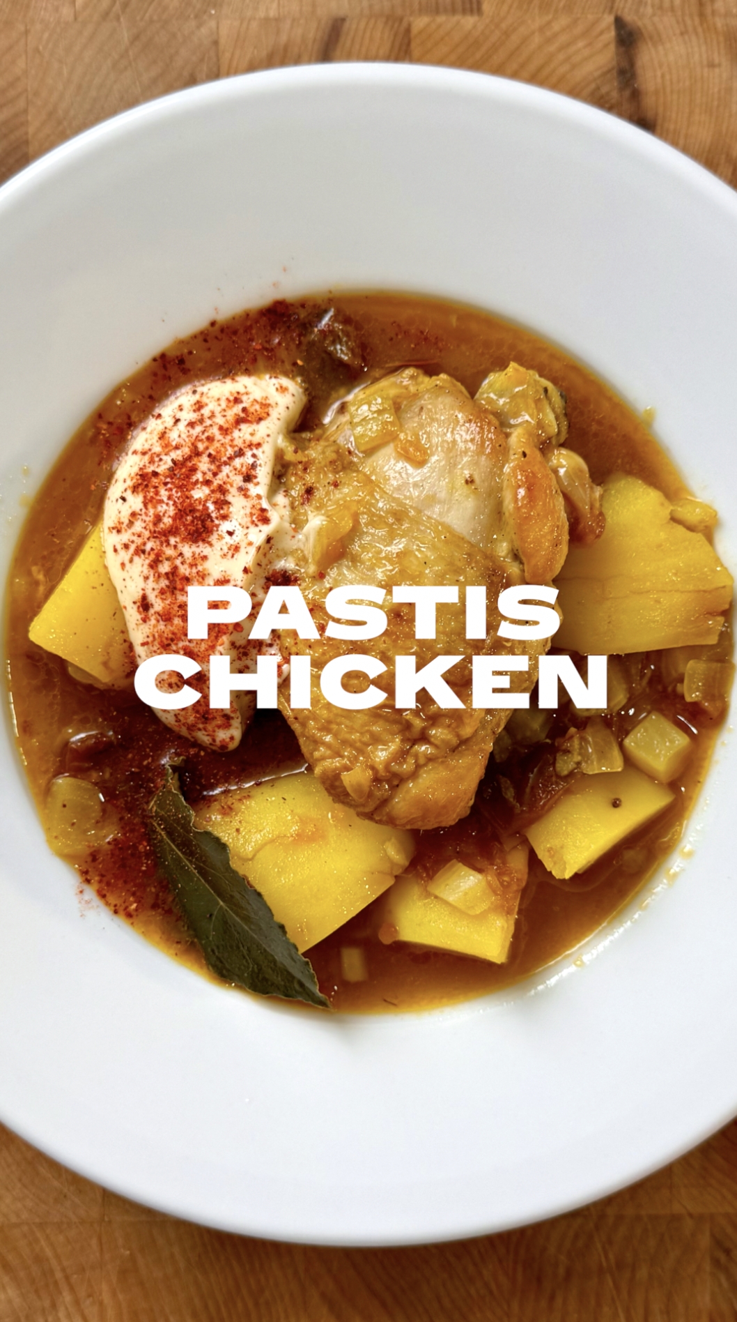 A one-pot chicken dish simmered with pastis, giving a gentle anise lift to a southern French classic.