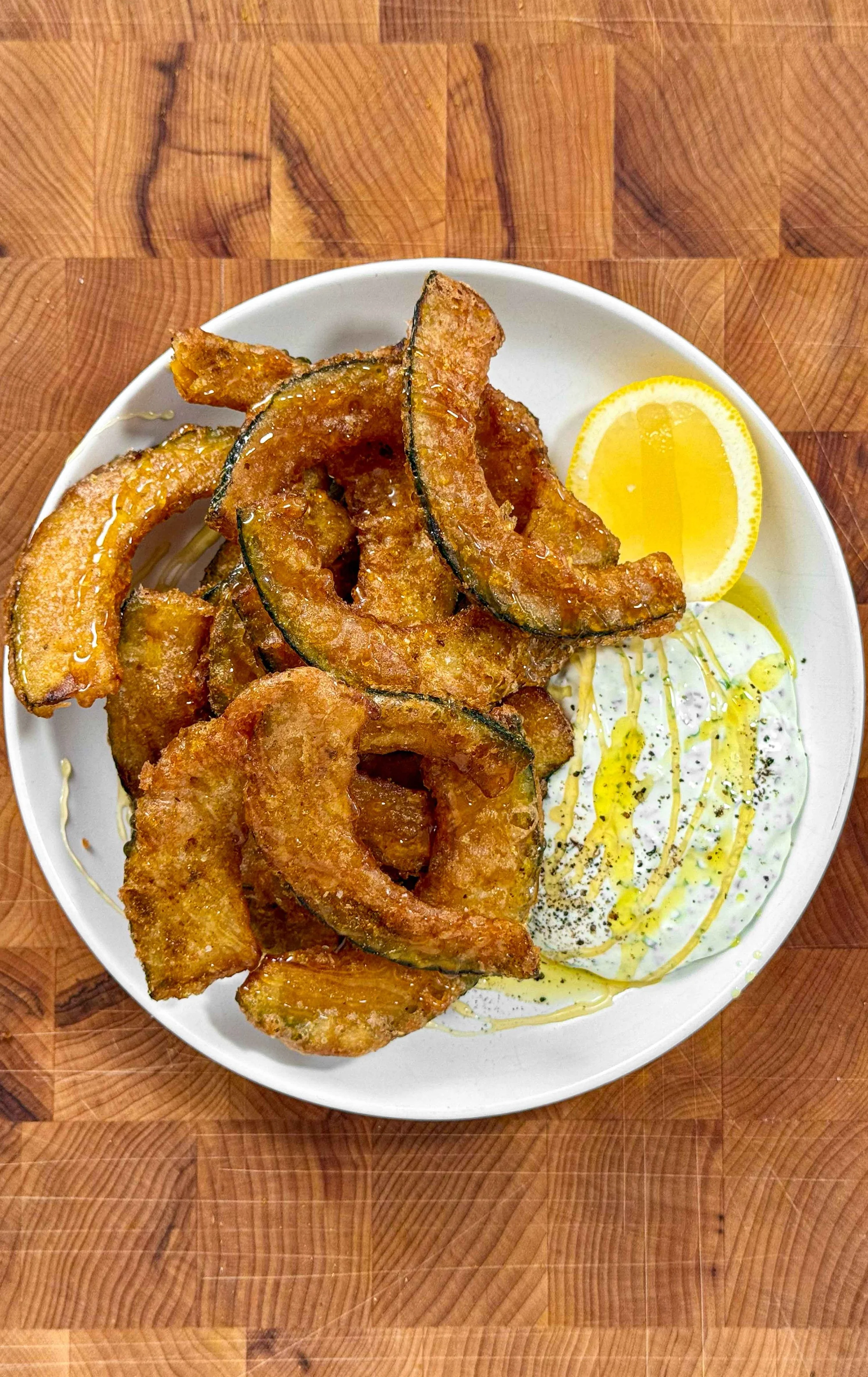 Dust pumpkin slices in flour and then place in batter, fry at 180c until golden and crispy.